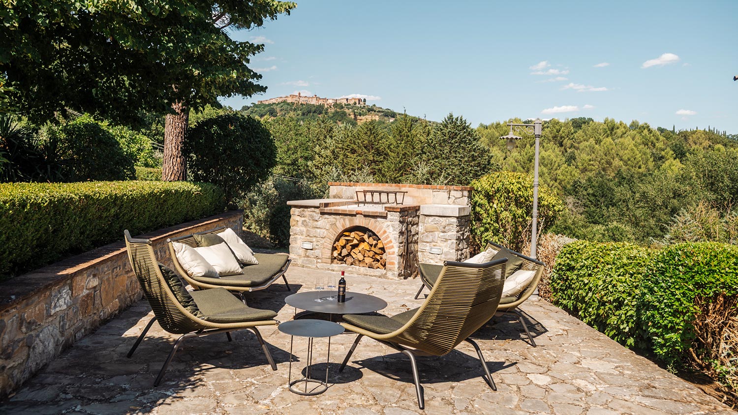 - Fireplace for grilling with seating area
