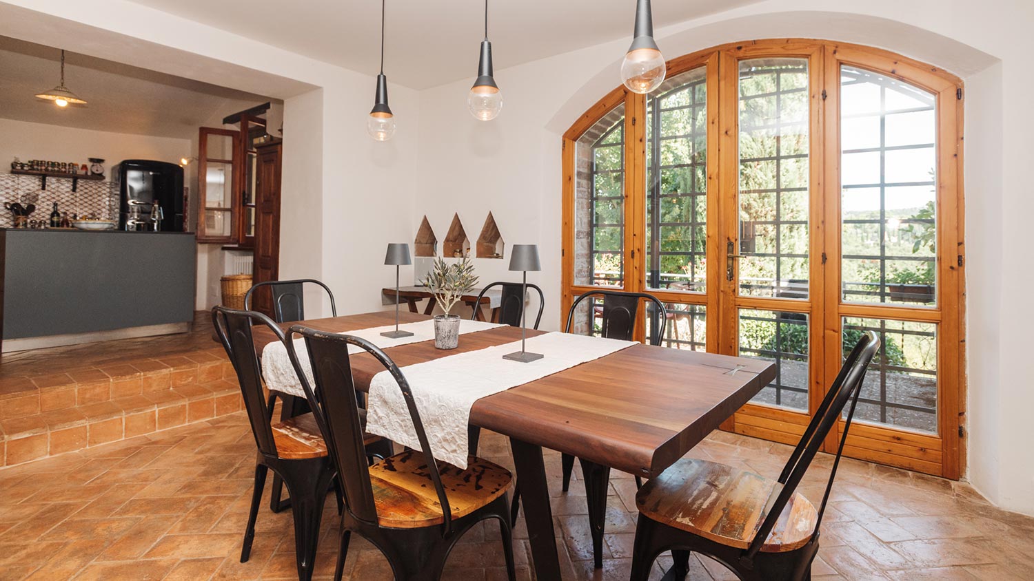 - Dining room with doors opening out onto an outside terrace with a view